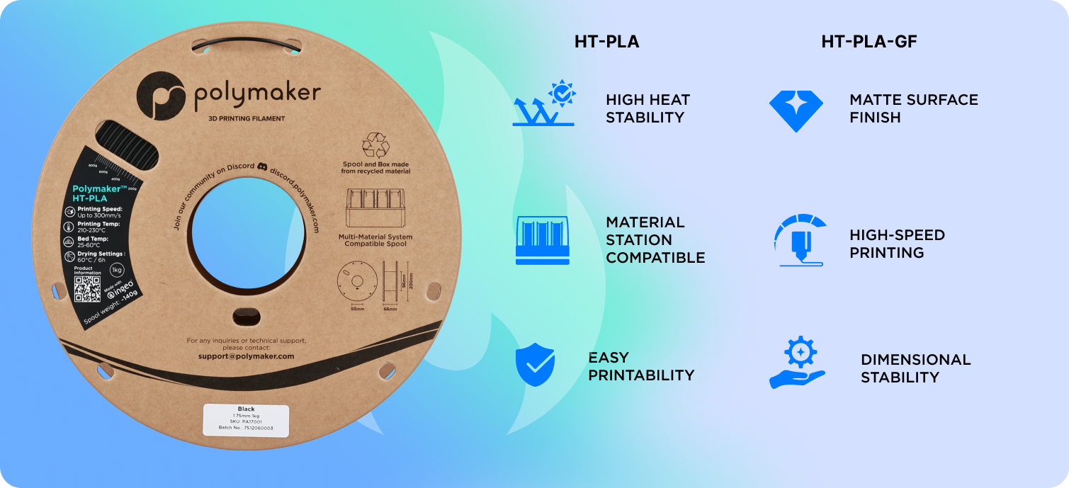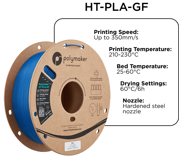 Polymaker™ HT-PLA is non-abrasive however Polymaker™ HT-PLA-GF has glass fibers so you will need a hardened nozzle to prevent wear and tear on your printer.