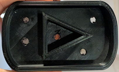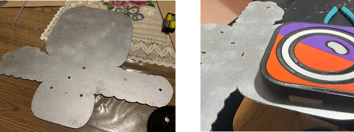 Next step, once the lighting system was finished, that remained was to paint the logo shape and fix the various prints to it through hot glue:
