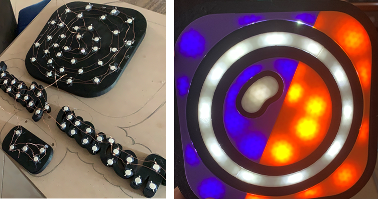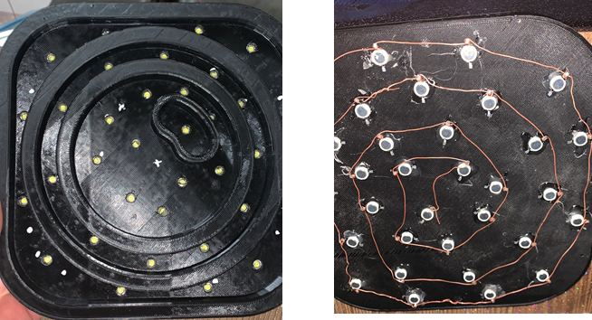 Then I glued the LEDs to the 3D printing with hot glue, maintaining an order of positive and negative poles in order to create a parallel lighting system. I recovered some copper wires and started to tie all the lights together and testing it: