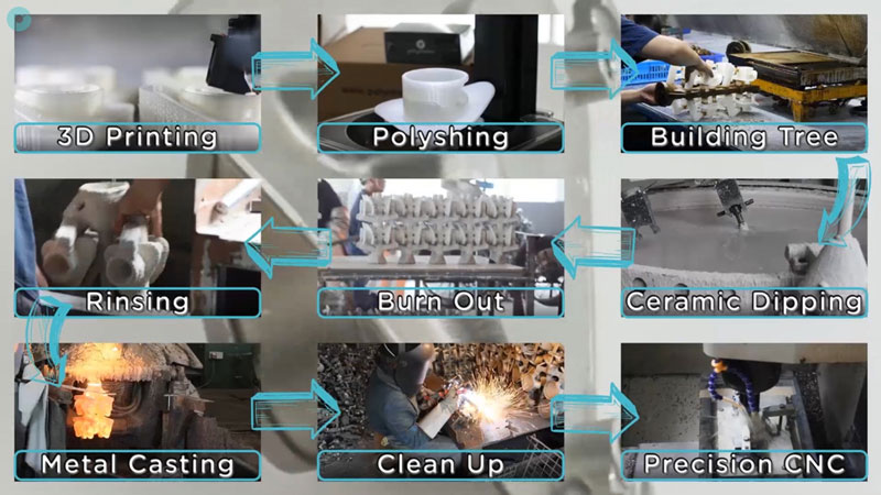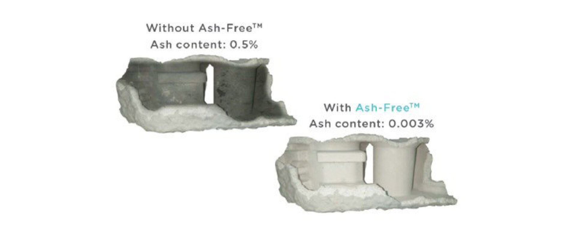 As previously mentioned PolyCast™ also has Layer-Free™ technology allowing the 3D printed parts to be polished to a smooth glossy surface, this greatly helps the molding process as bubbles can get trapped in between the layers causing defects in the mold which transfer to the metal parts. A typical investment casting process will go as follows. CAD designs are 3D printed using PolyCast™ and then polished inside the Polysher™, they are then attached to a wax tree which can hold multiple parts and consists of sprues and risers which help guide the flow of molten metal. The tree is then dipped in a ceramic slurry which coats all the surfaces of the tree and 3D printed parts. This is then showered with a silica particle which adds thickness and strength to the mold. This process is then repeated until a ceramic shell is built up around the 3D printed parts that is thick enough to withstand the molten metal. The ceramic shell is then fired in a kiln at temperatures of 1200°C, this cures the ceramic to create a very hard and heat resistant shell. It is during this process that the 3D printed patterns are burnt out of the ceramic shells. Ash-Free™ technology typically leaves and an ash residue of 0.003% by weight after burn out. This means that the 3D printed part has been completely vaporized by the high temperatures in the kiln producing a very clean casting surface on the inside of the ceramic mold. The molds are then used to pour molten metal into which solidifies in the pattern of the 3D printed parts. The metal tree is then broken free from the brittle ceramic shell and the individual parts are cut away from the tree which can be recycled. Parts are generally post-processed by a CNC milling machine to achieve the desired tolerances for precise machinery. In some cases, metal parts can be easily cleaned up by hand and are production ready without the need of CNC milling. Having a mold that is completely free of ash is essential to the final quality of the metal part and is the key technology that is employed on PolyCast™, Layer-Free™ technology ensures a bubble-free interface layer on ceramic molds and also sealing all surfaces on the 3D printed part which reduces time in the final post-processing of metal parts.