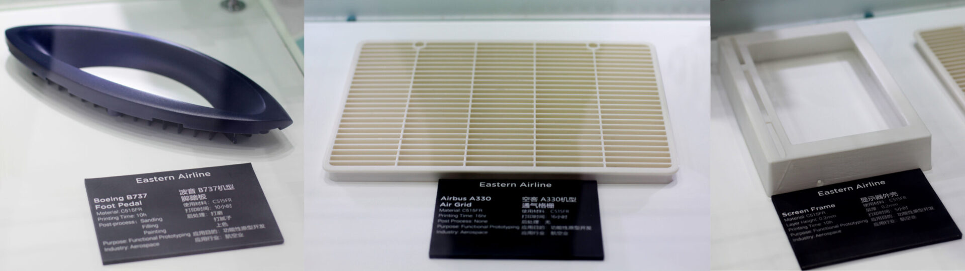 Polymaker developed a flame retardant Polycarbonate based material for China Eastern airline to produce interior spare parts in cabins. The application of 3D printing tech and Polymaker material will help China Eastern airline highly reduce the lead time and cost to get spare parts.