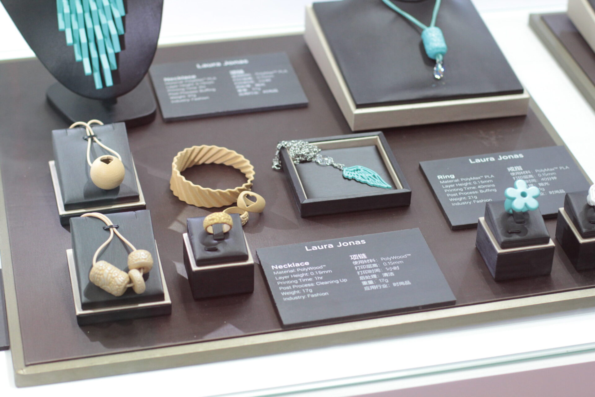 Czech brand, Laura Jonas, uses PolyMax™ PLA, PolySmooth™, and PolyWood™ to design and produce jewelry including Necklace, earrings, bracelet or even rings. The high-quality Polymaker materials and unique aesthetic options allow Laura Jonas to bring their design to life. Skilled designers take full advantages of 3D printing technologies, Polymaker materials’ aesthetic colors, the great toughness of PolyMax™ PLA, and the unique surface finish of PolySmooth™ and PolyWood™.