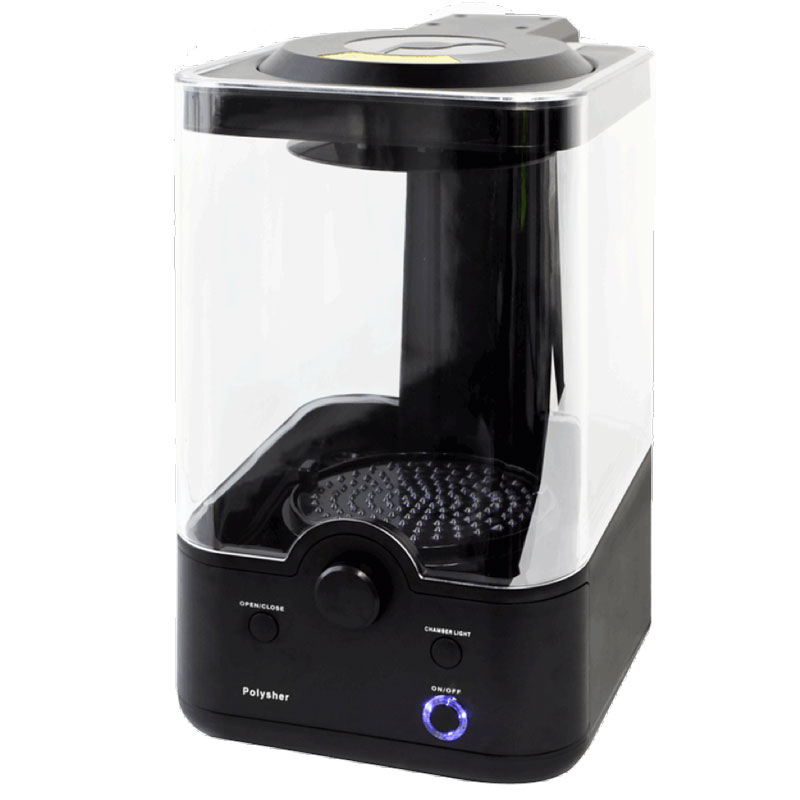 Polymaker set out to create a technology which could eliminate all layer lines from a 3D printed object while also being a hands-free process requiring no extra work or man hours. The process developed was named Layer-Free™ technology and was applied to their PolySmooth™ 3D printing filament. PolySmooth™ is a polyvinyl butyral (PVB) based material which displays excellent solubility in isopropyl alcohol (IPA), this meant that when a 3D printed part is exposed to IPA, the layers could be quickly melted and fused together. The result is a smooth glossy object that looks like an injection molded part. The Polysher™ was created as a desktop device that could deliver IPA to 3D printed parts in a very controlled manner. The Polysher™ uses an ultrasonic nebulizer to create a cold mist of liquid IPA which is contained within a chamber. 3D printed parts made from PolySmooth™ could be lowered into the chamber and exposed to the fog of IPA which would gently melt the surface layers together. Polymaker found that this process was the best way of applying IPA to PolySmooth™ parts as it polished objects quickly but wasn’t too aggressive allowing details on printed object to remain after polishing.