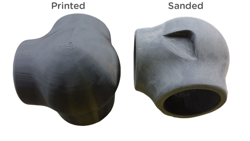 3D prints can also be post-processed by sanding the layers until the high points of the layers match the low point and a smooth plastic is revealed underneath. This could then, in turn, be painted or lacquered to achieve a glossy finish achieving the aesthetic look of an injection molded part. This would recreate the image of plastic parts as consumers knew them, but the problems faced are that is it unfeasible to manufacture with such an intense workload in the post-processing of plastic parts.
