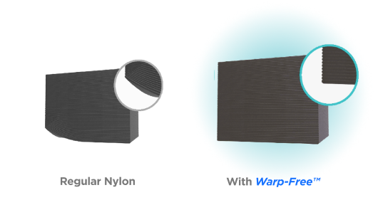 Warp-Free™(防翘曲技术)最主要作用是使基于尼龙而生产的3D打印材料可以拥有出色的尺寸稳定性和近乎于零的翘曲率。