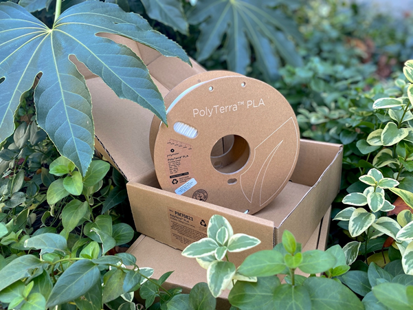PolyTerra™ PLA is wound on a fully recycled cardboard spool with recycled labels and outer packaging. The product information sheet has moved online, and any unnecessary paper has been removed from the packaging to cut down on waste.