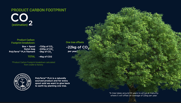 To offset the carbon created to make and ship a spool of PolyTerra™ PLA, Polymaker will plant one tree for every spool sold, local to the place of purchase in partnership with OneTreePlanted.org. Once the tree hits maturity it has the ability to suck in 22kg of carbon dioxide each year massively offsetting the 4kg required to create a spool of PolyTerra™ PLA.