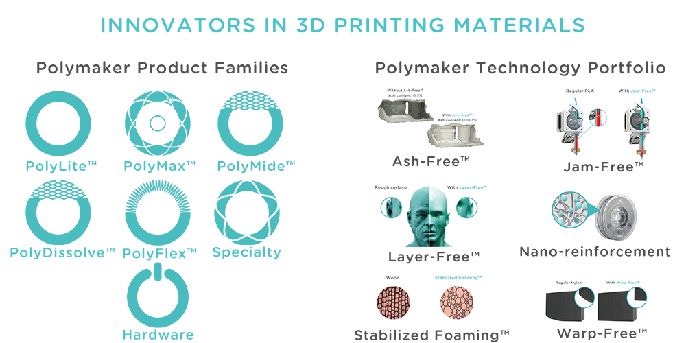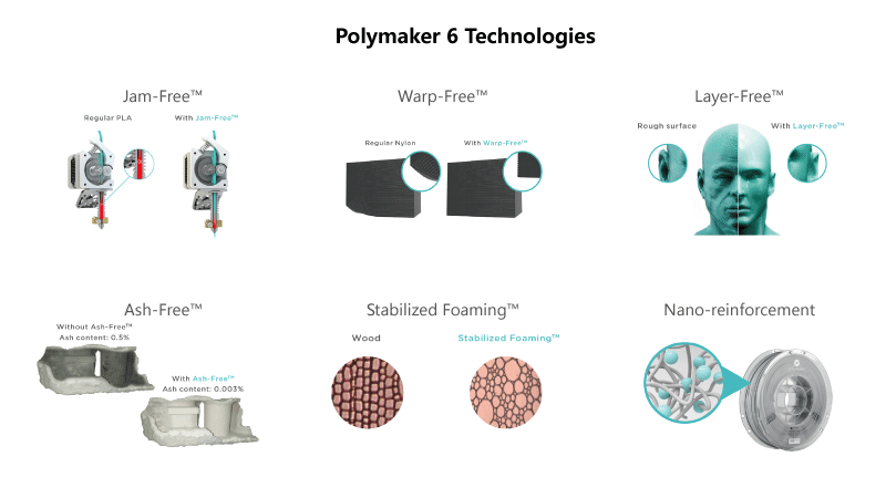 What sets Polymaker apart from their competitors? In house technologies. Polymaker now has 6 technologies: Jam-Free™, Warp-Free™, Layer-Free™, Ash-Free™, Nano-reinforcement, and Stabilized Foaming™.