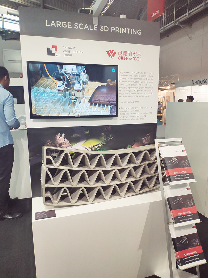 Polymaker has invited their large scale 3D printing partner Coin-Robotics to join the exhibition. Coin-Robotics successfully 3D printed the first plastic pedestrian footbridge for Shanghai Construction Group at the beginning of this year.