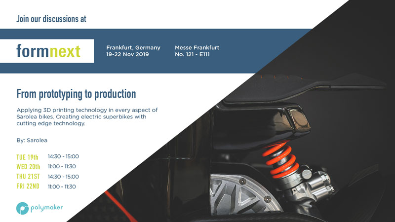Polymaker will be featuring the N60 electric superbike at the Polymaker booth during FormNext 2019 (Booth Number 1211-E111). Displaying three parts that represent stages of production in use at Sarolea. Furthermore, Rob Mitchell from Sarolea will be hosting an open talk during the show on the Polymaker booth, explaining Sarolea's relationship with 3D printing and the journey from prototyping to production.